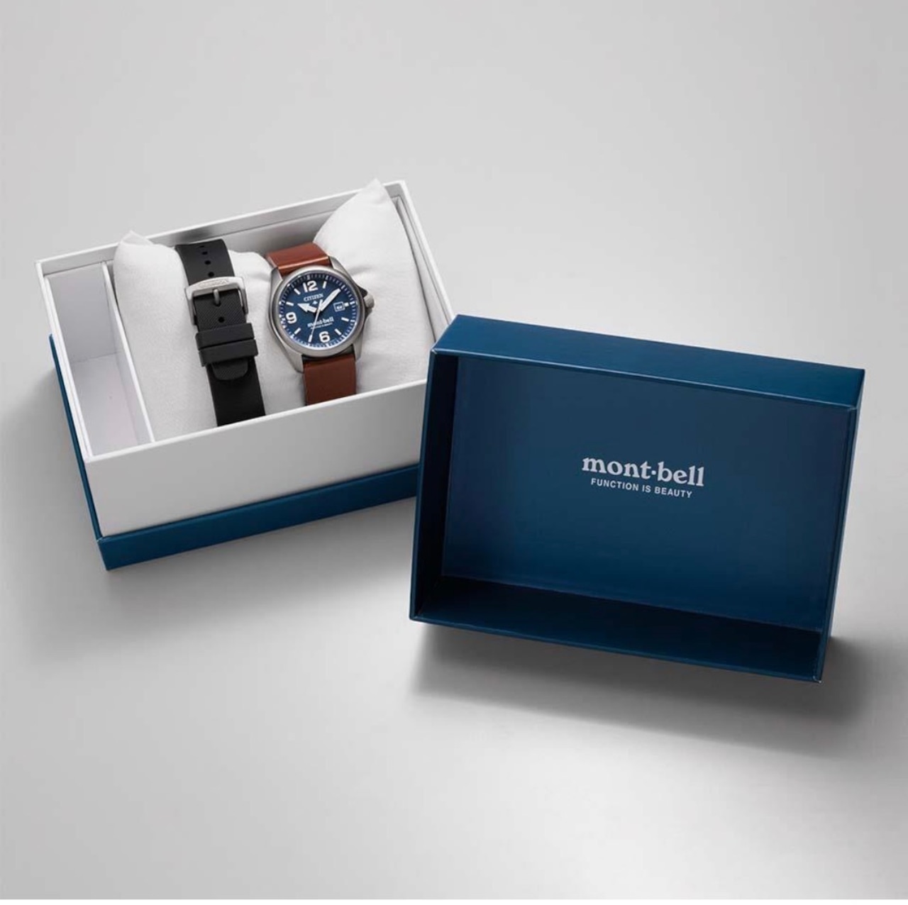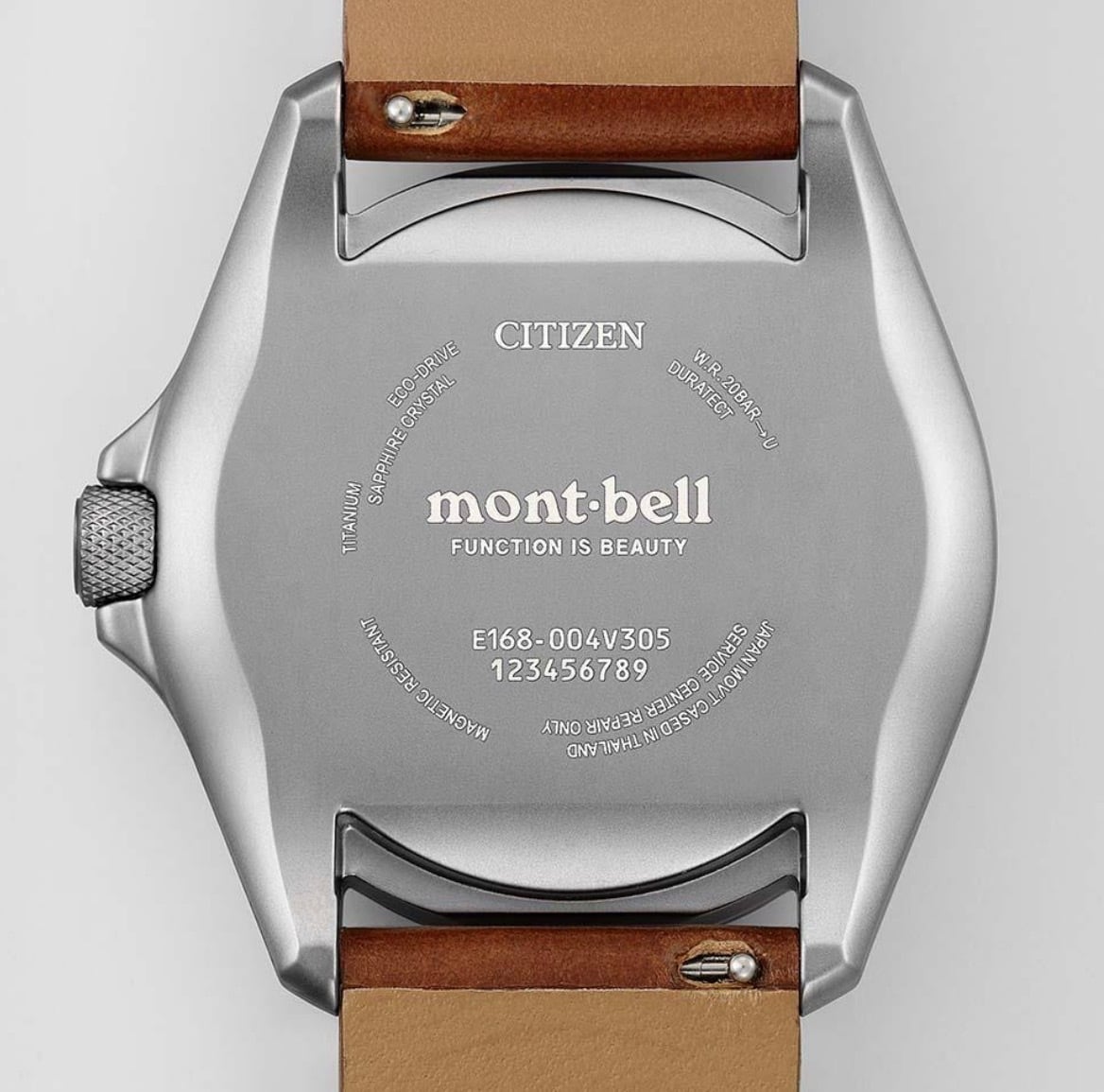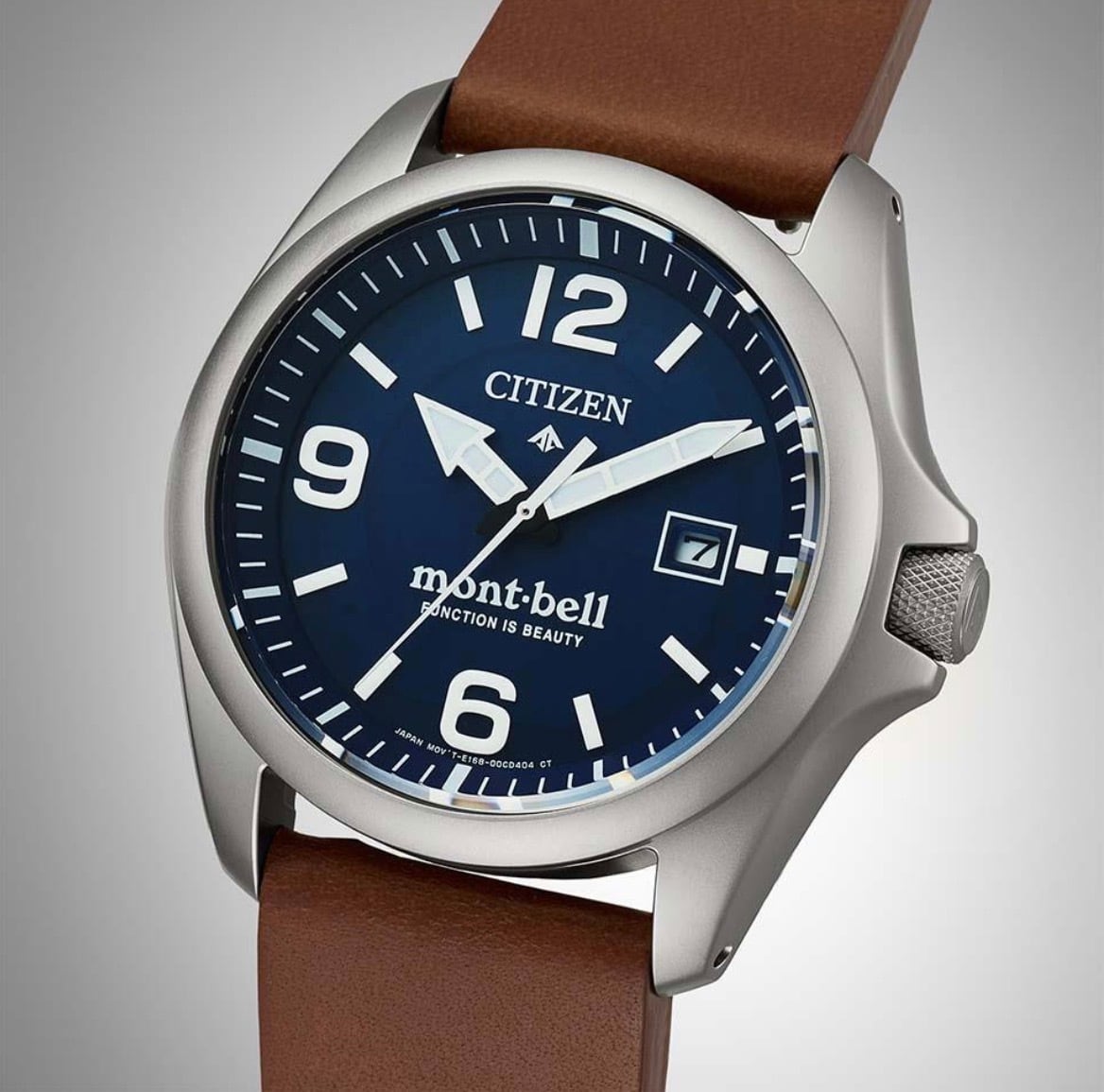 ダイバーズウオッチ用に開発されたCal.E168を搭載。アウトドアのハードな環境にも耐え抜くタフさ、昼夜問わない時刻の見やすさ、操作の簡単さといった、優れた実用性を備える1本です。ケースには打ちキズにも強いデュラテクトMRKを施しています。革バンドモデルは、シリコーンラバーバンド付属の2way仕様。ご自身でシーンに合わせて交換できるインターチェンジャブル構造です。裏ぶたレス構造のケースバックには、モンベルのブランドロゴをレーザー刻印。CITIZEN×mont-bellのロゴが入った専用ボックス付きです。