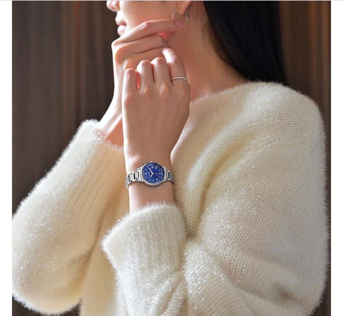 冬の澄んだ空気を表現したブルーの文字板に、ステンドグラスのキラキラとした輝きをイメージしたパターンを繊細に描いたデザイン。インデックスには、すっきりとした印象のローマ数字とともに、拡散する光を表現したカットパーツをレイアウトしています。9時の位置には1ポイントのラボグロウン・ダイヤモンドをセッティング。腕元に華やかさを添える1本です。