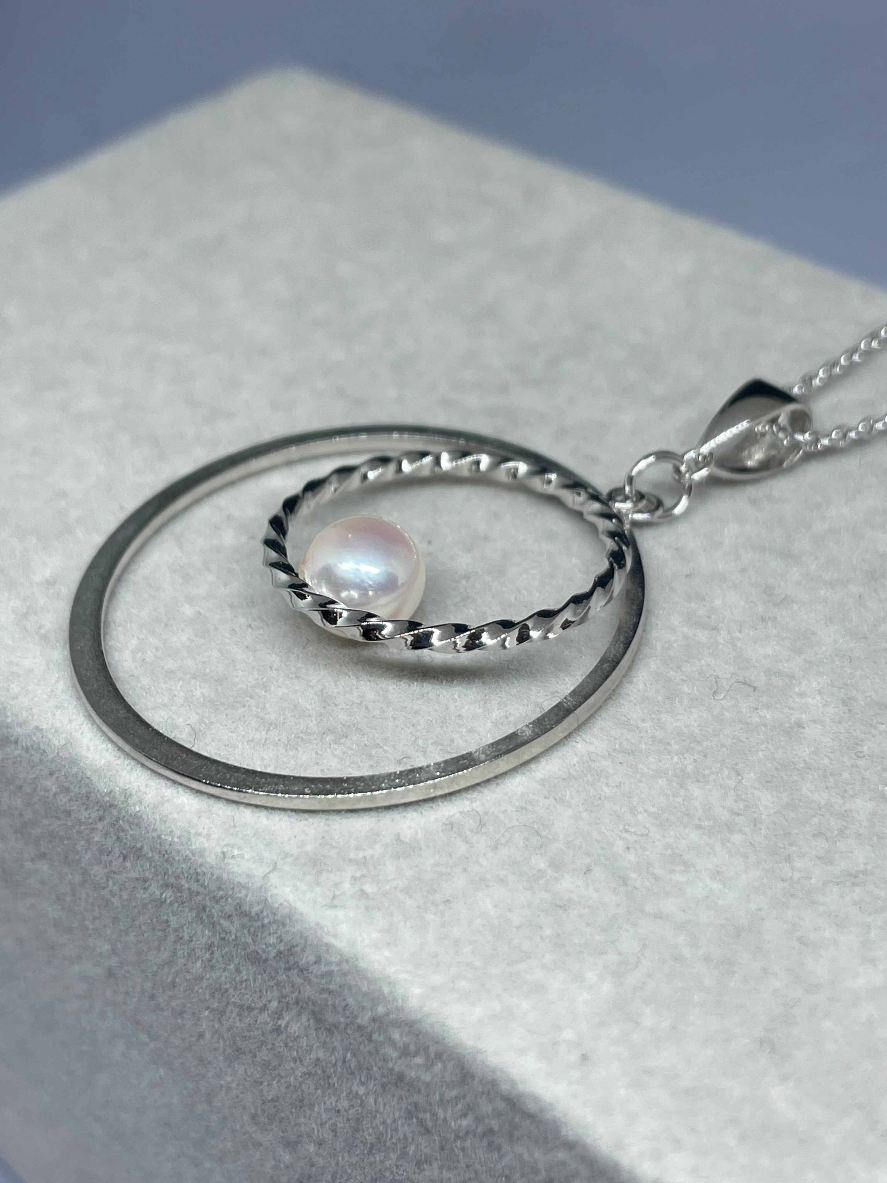 重なる2つのサークルの中に一粒のあこや真珠をセッティングしたロングネックレスです。